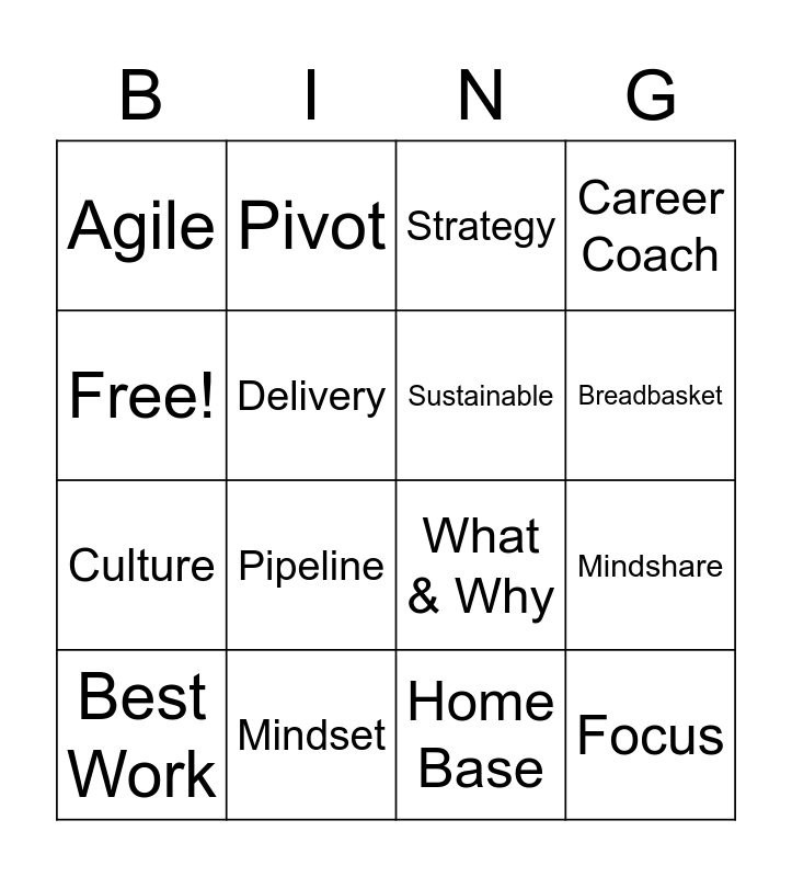 This bingo card has 16 words: Mindset, Mindshare, Strategy, Agile, Culture, Pivot, What & Why, Home Base, Free!, Delivery, Best Work, Career Coach, Pipeline, Breadbasket, Sustainable and Focus.