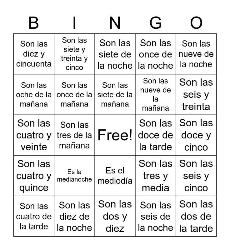 This bingo card has a free space and 45 words: Es la una de la tarde, Son las dos de la tarde, Son las tres de la tarde, Son las cuatro de la tarde, Son las cinco de la noche, Son las seis de la noche, Son las siete de la noche, Son las ocho de la noche, Son las nueve de la noche, Son las diez de la noche, Son las once de la noche, Son las doce de la tarde, Es el mediodía, Es la medianoche, Es la una y cinco, Son las dos y diez, Son las tres y quince, Son las cuatro y veinte, Son las cinco y veinticinco, Son las seis y treinta, Son las siete y treinta y cinco, Son las ocho y cuarenta, Son las nueve y cuarenta y cinco, Son las diez y cincuenta, Son las once y cincuenta y cinco, Son las doce y cinco, Es la una y cincuenta, Son las dos y cuarenta, Son las tres y media, Son las cuatro y quince, Son las cinco y veinte, Son las seis y cinco, Son las siete y diez, Es la una de la mañana, Son las dos de la mañana, Son las tres de la mañana, Son las cuatro de la mañana, Son las cinco de la mañana, Son las seis de la mañana, Son las siete de la mañana, Son las oche de la mañana, Son las nueve de la mañana, Son las diez de la mañana, Son las once de la mañana and Son las doce de la mañana.
