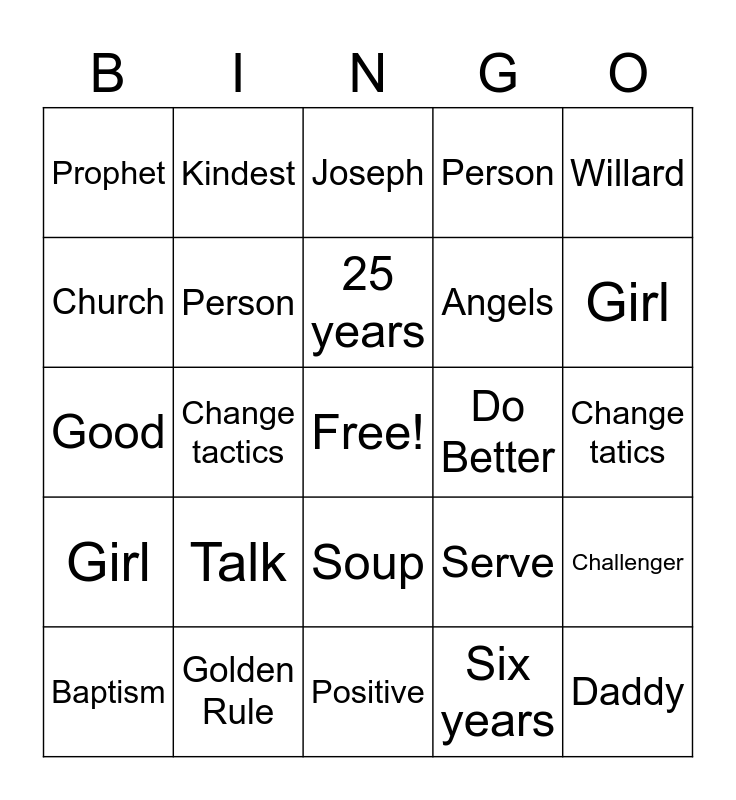 This bingo card has a free space and 162 words: Three, Get up!, Utah, Love, Smith, Champ, Bean, Mission, Willard, Farm, Church, Rebecca, Joseph, Call, Serve, Palmyra, Stafford Road, Fight, Believe, Welcome, Good, Book Of Mormon, Sale, Angels, Baptism, Evening, Prophet, Bible, Hurt, Power, Open, Baby, Amen, Morning, Vision, Hill Cumorah, Never, Positive, Road, Wonderful, Girl, Puppy, Happy, Work, Gold, Homework, Husband, Missionary, Sacred Grove, Family, Kindest, Him, Friends, Good, Nice, Six years, Preacher, Knockout, Challenger, Sport, Daddy, Fight, Change tatics, Talk, Struggle, Soup, Soul, Mending Fences, Problem, Golden Rule, Apple Pie, Do Better, Person, Feelings, Best Friend, Thank you, Barn, Hello, Mailman, 25 years, Bless you, Three, Get up!, Utah, Love, Smith, Champ, Bean, Mission, Willard, Farm, Church, Rebecca, Joseph, Call, Serve, Palmyra, Stafford Road, Fight, Believe, Welcome, Good, Book Of Mormon, Sale, Angels, Baptism, Evening, Prophet, Bible, Hurt, Power, Open, Baby, Amen, Morning, Vision, Hill Cumorah, Never, Positive, Road, Wonderful, Girl, Puppy, Happy, Work, Gold, Homework, Husband, Missionary, Sacred Grove, Family, Kindest, Him, Friends, Good, Nice, Six years, Preacher, Knockout, Challenger, Sport, Daddy, Fight, Change tactics, Talk, Struggle, Soup, Soul, Mending Fences, Problem, Golden Rule, Apple Pie, Do Better, Person, Feelings, Best Friend, Thank you, Barn, Hello, Mailman, 25 years and Bless you.