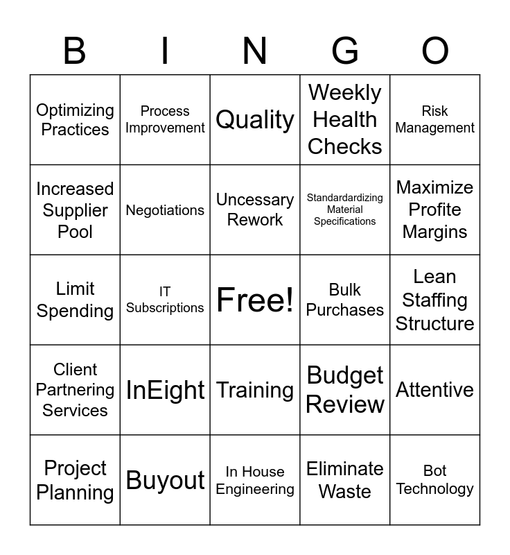 This bingo card has a free space and 34 words: Reduce Cost, Eliminate Waste, Increase Efficiency, Return on Investment, Client Partnering Services, Negotiations, Risk Management, Project Planning, Process Improvement, Standard Processes, Uncessary Rework, Quality, Safety, Accuracy, Bulk Purchases, Maximize Profite Margins, Buyout, Limit Spending, InEight, Budget Review, Training, Injury Risk, Optimizing Practices, Lean Staffing Structure, In House Engineering, Bot Technology, Weekly Health Checks, Phase Gates, Standardardizing Material Specifications, Increased Supplier Pool, Stop Work, IT Subscriptions, Attentive and Bidding.