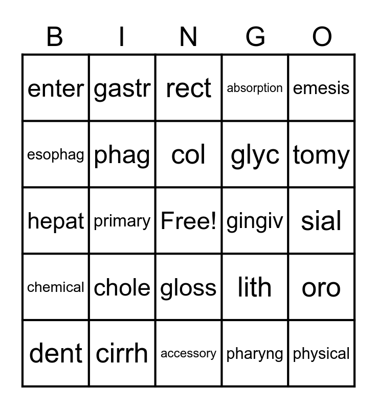This bingo card has a free space and 24 words: chole, cirrh, col, dent, emesis, enter, esophag, gastr, gingiv, gloss, glyc, hepat, lith, oro, phag, pharyng, sial, rect, tomy, primary, physical, chemical, absorption and accessory.