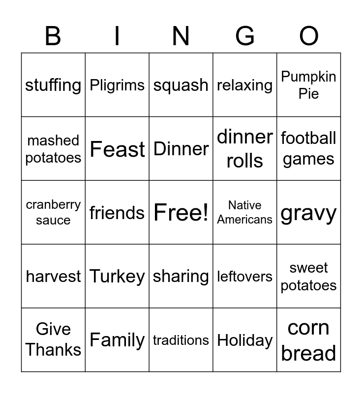 This bingo card has a free space and 24 words: Turkey, Family, Dinner, Give Thanks, Pumpkin Pie, stuffing, mashed potatoes, Pligrims, Native Americans, sharing, dinner rolls, cranberry sauce, leftovers, sweet potatoes, Feast, Holiday, gravy, squash, football games, friends, corn bread, harvest, relaxing and traditions.