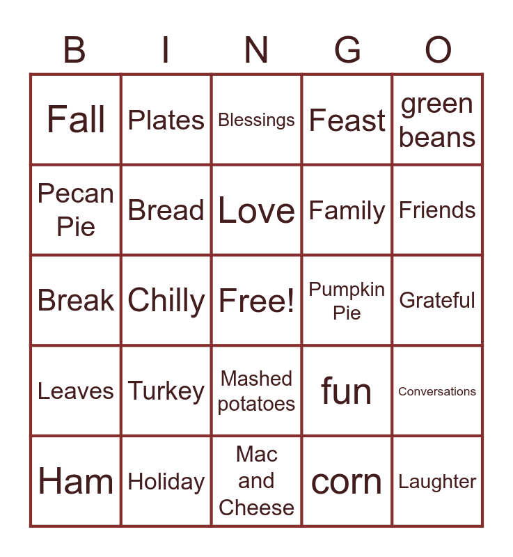 This bingo card has a free space and 29 words: Ham, indians, Chilly, Pilgrims, Fall, Blessings, Bread, Turkey, Pumpkin Pie, Holiday, Grateful, Laughter, Mac and Cheese, corn, Friends, Games, Mashed potatoes, Leaves, green beans, Break, fun, Harvest, Family, Pecan Pie, Feast, Plates, Conversations, Love and Joy.