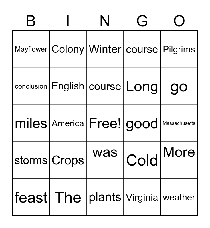 This bingo card has a free space and 24 words: Crops, The, course, feast, Pilgrims, Mayflower, conclusion, Colony, good, was, Long, miles, Cold, More, English, Virginia, Massachusetts, Winter, go, America, weather, storms, course and plants.