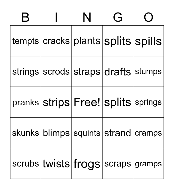 This bingo card has a free space and 24 words: blimps, twists, straps, scrubs, spills, tempts, strings, cracks, splits, squints, drafts, pranks, strand, cramps, scrods, scraps, springs, plants, stumps, strips, gramps, skunks, splits and frogs.