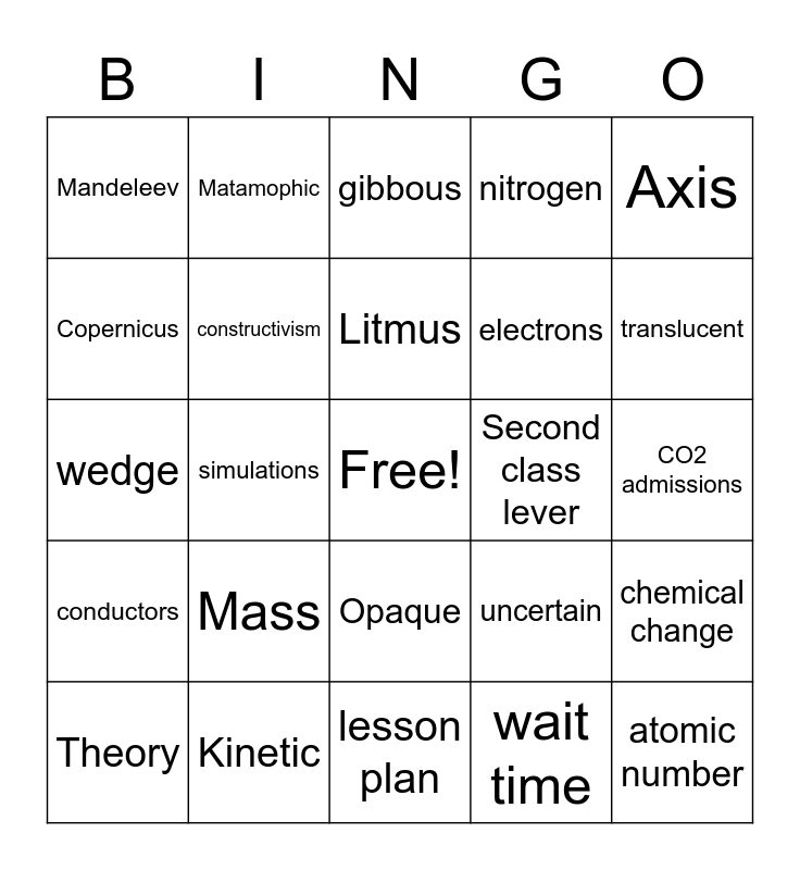 This bingo card has a free space and 24 words: Mass, Kinetic, Litmus, Theory, Axis, Mandeleev, Copernicus, Matamophic, Second class lever, Opaque, electrons, wedge, uncertain, chemical change, constructivism, wait time, CO2 admissions, gibbous, translucent, simulations, atomic number, conductors, nitrogen and lesson plan.