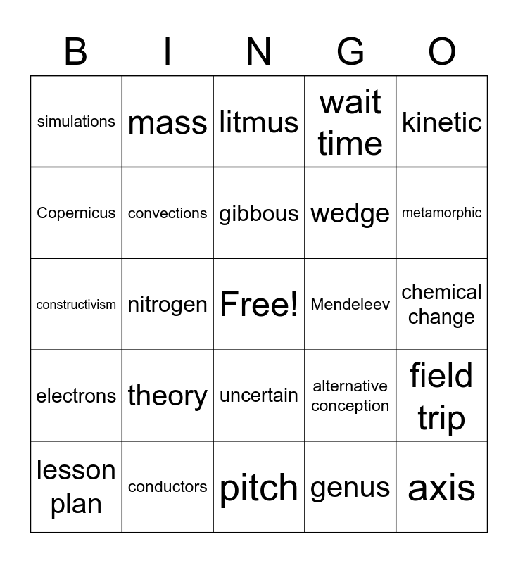 This bingo card has a free space and 24 words: theory, conductors, gibbous, lesson plan, kinetic, simulations, Copernicus, mass, Mendeleev, uncertain, wedge, constructivism, alternative conception, field trip, convections, genus, chemical change, litmus, metamorphic, nitrogen, axis, electrons, wait time and pitch.