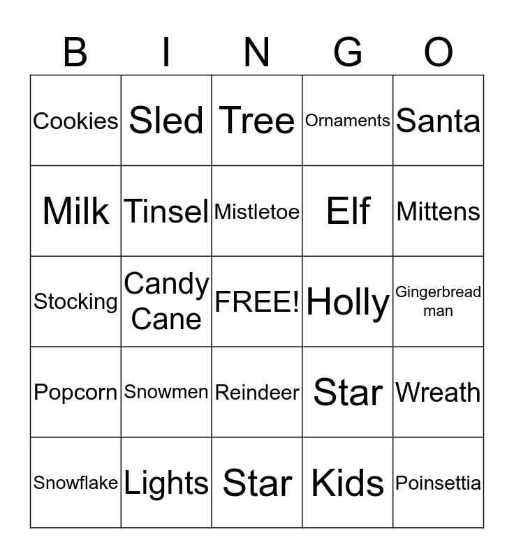 This bingo card has a free space and 24 words: Snowmen, Lights, Mistletoe, Snowflake, Santa, Cookies, Milk, Sled, Holly, Reindeer, Elf, Stocking, Star, Wreath, Tinsel, Kids, Gingerbread man, Tree, Mittens, Candy Cane, Poinsettia, Popcorn, Ornaments and Star.