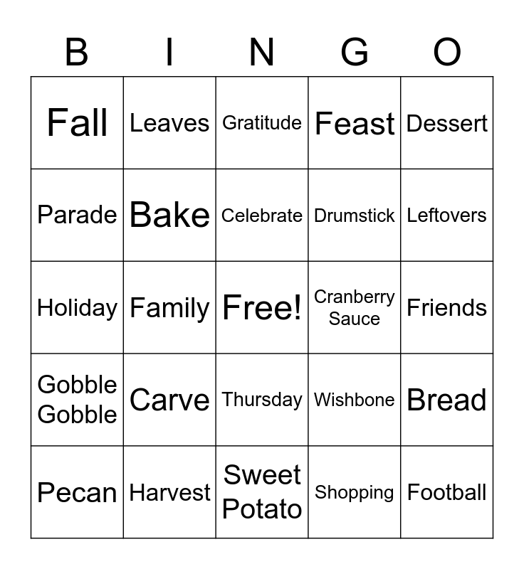 This bingo card has a free space and 38 words: Acorn, Apple Pie, Autumn, Bake, Bread, Carve, Celebrate, Cook, Dessert, Drumstick, Family, Feast, Football, Friends, Parade, Gobble Gobble, Grateful, Gratitude, Cornucopia, Cranberry Sauce, Fall, Harvest, Leftovers, Pecan, Pumpkin, Sweet Potato, Stuffing, Thankful, Turkey, Tasty, November, Thursday, Shopping, Leaves, Tradition, Wishbone, Holiday and Home.