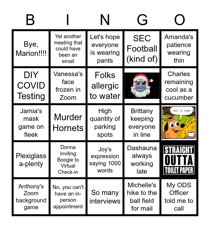 This bingo card has 4 images and 30 words: My ODS Officer told me to call, Michelle's hike to the ball field for mail, Students topless at intake, Plexiglass a-plenty, Vanessa's face frozen in Zoom, Amanda's patience wearing thin, Anthony's Zoom background game, Yet another meeting that could have been an email, WiFi on the fritz, Folks allergic to water, Let's hope everyone is wearing pants, Free!, Amy kicking it in socks and slippers, Brittany keeping everyone in line, Charles remaining cool as a cucumber, No, you can't have an in-person appointment, Jamia's mask game on fleek, Donna inviting Boogie to Virtual Check-in, Dashauna always working late, Joy's expression saying 1000 words, No student workers to fuss at, Bye, Marion!!!!, So many interviews, High quantity of parking spots, SEC Football (kind of), A whopping 15 tests a day, DIY COVID Testing, Binge-watching Tiger King, Murder Hornets and It's not COVID, it's allergies.