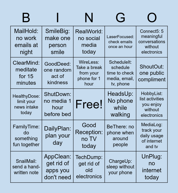 This bingo card has a free space and 24 words: DailyPlan: plan your day, AppClean: get rid of apps you don't need, WireLess: Take a break from your phone for 1 hour, SnailMail: send a hand-written note, Connect5: 5 meaningful conversations without electronics, MailHold: no work emails at night, ClearMind: meditate for 15 minutes, SmileBig: make one person smile, HeadsUp: No phone while walking, Good Reception: no TV today, ScheduleIt: schedule time to check media, email, tv, phone, HealthyDose: limit your news intake today, BeThere: no phone when around people, MediaLog: track your daily usage of internet and tv, GoodDeed: one random act of kindness, ChargeUp: sleep without your phone, HobbyList: list activities you enjoy without electronics, RealWorld: no social media today, ShoutOut: one public compliment, ShutDown: no media 1 hour before bed, UnPlug: no internet today, FamilyTime: do something fun together, LaserFocused: check emails once an hour and TechDump: get rid of old electronics.