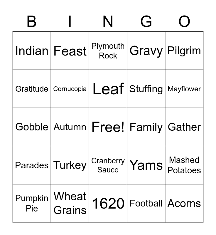 This bingo card has a free space and 24 words: Turkey, Wheat Grains, Leaf, Pumpkin Pie, Pilgrim, Indian, Gratitude, Feast, Family, Cranberry Sauce, Stuffing, Gobble, Yams, Mashed Potatoes, Cornucopia, Football, Gather, Plymouth Rock, Mayflower, Autumn, Acorns, Parades, Gravy and 1620.