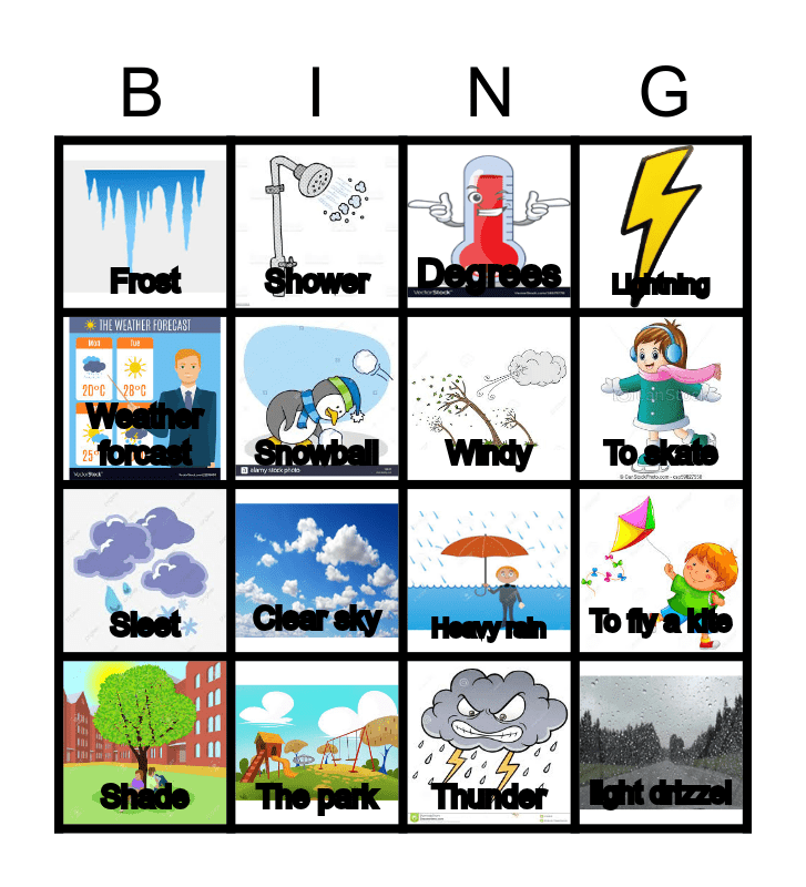 This bingo card has 18 images and 18 words: Clear sky, light drizzel, Degrees, Frost, Heavy rain, Lightning, Shade, Shower, To skate, Sleet, Thunder, Weather forcast, To fly a kite, Snowball, Windy, The sun, The park and To surf.