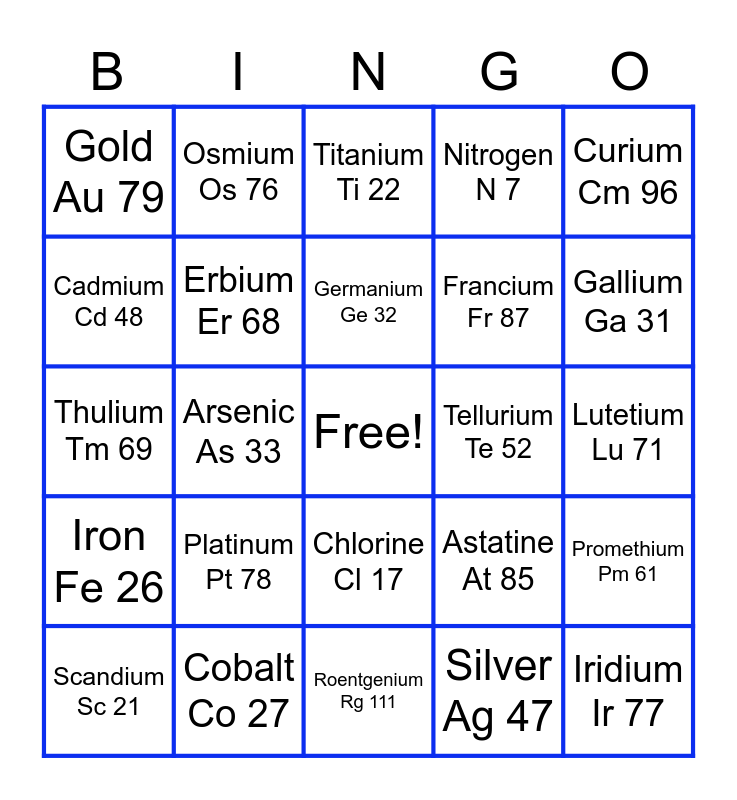 This bingo card has a free space and 118 words: Hydrogen H 1, Helium He 2, Lithium Li 3, Beryllium Be 4, Boron B 5, Carbon C 6, Nitrogen N 7, Oxygen O 8, Fluorine F 9, Neon Ne 10, Sodium Na 11, Magnesium Mg 12, Aluminium Al 13, Silicon Si 14, Phosphorus P 15, Sulfur S 16, Chlorine Cl 17, Argon Ar 18, Potassium K 19, Calcium Ca 20, Scandium Sc 21, Titanium Ti 22, Vanadium V 23, Chromium Cr 24, Manganese Mn 25, Iron Fe 26, Cobalt Co 27, Nickel Ni 28, Copper Cu 29, Zinc Zn 30, Gallium Ga 31, Germanium Ge 32, Arsenic As 33, Selenium Se 34, Bromine Br 35, Krypton Kr 36, Rubidium Rb 37, Strontium Sr 38, Yttrium Y 39, Zirconium Zr 40, Niobium Nb 41, Molybdenum Mo 42, Technetium Tc 43, Ruthenium Ru 44, Rhodium Rh 45, Palladium Pd 46, Silver Ag 47, Cadmium Cd 48, Indium In 49, Tin Sn 50, Antimony Sb 51, Tellurium Te 52, Iodine I 53, Xenon Xe 54, Cesium Cs 55, Barium Ba 56, Lanthanum La 57, Cerium Ce 58, Praseodymium Pr 59, Neodymium Nd 60, Promethium Pm 61, Samarium Sm 62, Europium Eu 63, Gadolinium Gd 64, Terbium Tb 65, Dysprosium Dy 66, Holmium Ho 67, Erbium Er 68, Thulium Tm 69, Ytterbium Yb 70, Lutetium Lu 71, Hafnium Hf 72, Tantalum Ta 73, Tungsten W 74, Rhenium Re 75, Osmium Os 76, Iridium Ir 77, Platinum Pt 78, Gold Au 79, Mercury Hg 80, Thallium Tl 81, Lead Pb 82, Bismuth Bi 83, Polonium Po 84, Astatine At 85, Radon Rn 86, Francium Fr 87, Radium Ra 88, Actinium Ac 89, Thorium Th 90, Protactinium Pa 91, Uranium U 92, Neptunium Np 93, Plutonium Pu 94, Americium Am 95, Curium Cm 96, Berkelium Bk 97, Californium Cf 98, Einsteinium Es 99, Fermium Fm 100, Mendelevium Md 101, Nobelium No 102, Lawrencium Lr 103, Rutherfordium Rf 104, Dubnium Db 105, Seaborgium Sg 106, Bohrium Bh 107, Hassium Hs 108, Meitnerium Mt 109, Darmstadtium Ds 110, Roentgenium Rg 111, Copernicium Cn 112, Nihonium Nh 113, Flerovium Fl 114, Moscovium Mc 115, Livermorium Lv 116, Tennessine Ts 117 and Oganesson Og 118.
