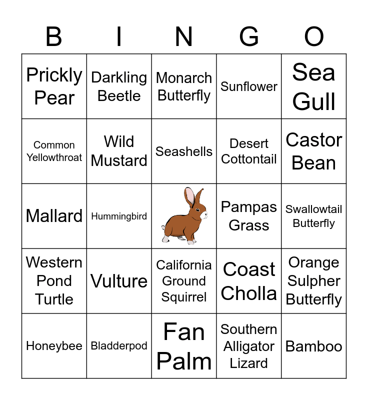 This bingo card has a free space and 24 words: Vulture, Bladderpod, Seashells, Honeybee, Sea Gull, Prickly Pear, Common Yellowthroat, Darkling Beetle, Pampas Grass, California Ground Squirrel, Desert Cottontail, Mallard, Coast Cholla, Orange Sulpher Butterfly, Wild Mustard, Southern Alligator Lizard, Swallowtail Butterfly, Monarch Butterfly, Castor Bean, Hummingbird, Bamboo, Western Pond Turtle, Sunflower and Fan Palm.