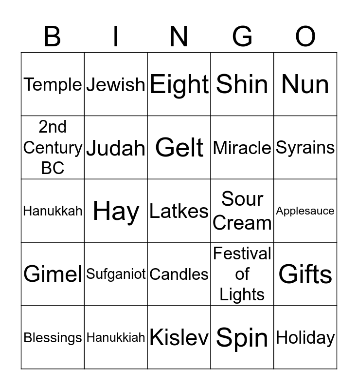 This bingo card has 41 words: FREE!, Hanukkah, Maccabees, Judah, Hanukkiah, Candles, Gelt, Dreidel, Nun, Gimel, Hay, Shin, Latkes, Applesauce, Sour Cream, Sufganiot, Oil, Temple, December, Eight, Gifts, Holiday, Kislev, Miracle, Re-dedication, Shamash, Spin, Sundown, Syrains, Maccabean Revolt, Shehecheyanu, Jewish, Blessings, Matches, Festival of Lights, 2nd Century BC, Jerusalem, Rabbi, Cantor, TRZ and Jelly.