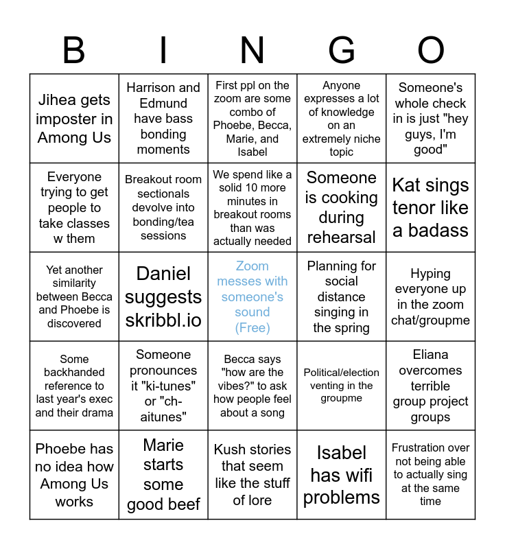 This bingo card has a free space and 24 words: Someone pronounces it "ki-tunes" or "ch-aitunes", Marie starts some good beef, We spend like a solid 10 more minutes in breakout rooms than was actually needed, Phoebe has no idea how Among Us works, Someone's whole check in is just "hey guys, I'm good", Jihea gets imposter in Among Us, Everyone trying to get people to take classes w them, Harrison and Edmund have bass bonding moments, Planning for social distance singing in the spring, Becca says "how are the vibes?" to ask how people feel about a song, Someone is cooking during rehearsal, Yet another similarity between Becca and Phoebe is discovered, Political/election venting in the groupme, Eliana overcomes terrible group project groups, Breakout room sectionals devolve into bonding/tea sessions, Isabel has wifi problems, Hyping everyone up in the zoom chat/groupme, First ppl on the zoom are some combo of Phoebe, Becca, Marie, and Isabel, Kat sings tenor like a badass, Daniel suggests skribbl.io, Frustration over not being able to actually sing at the same time, Some backhanded reference to last year's exec and their drama, Anyone expresses a lot of knowledge on an extremely niche topic and Kush stories that seem like the stuff of lore.