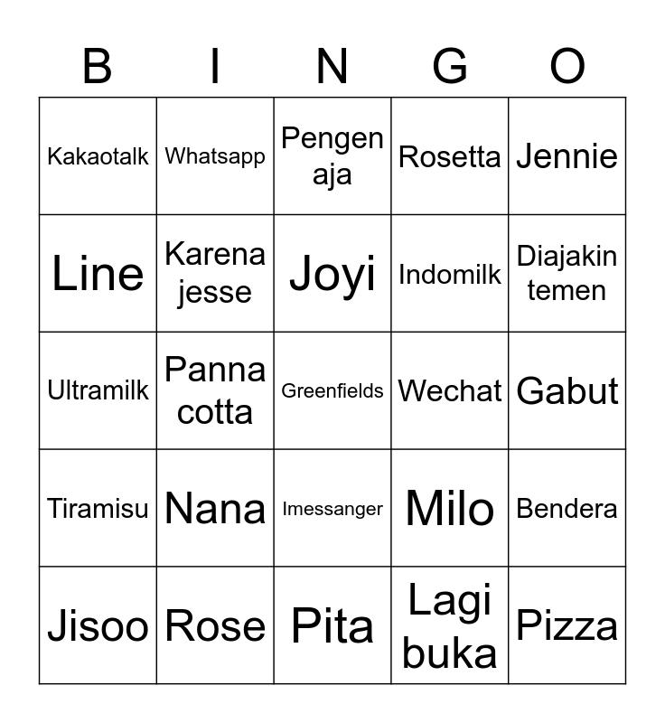 This bingo card has a free space and 24 words: Nana, Rose, Joyi, Jisoo, Jennie, Kakaotalk, Line, Whatsapp, Wechat, Imessanger, Indomilk, Ultramilk, Milo, Bendera, Karena jesse, Lagi buka, Gabut, Pengen aja, Diajakin temen, Panna cotta, Pizza, Tiramisu, Rosetta and Pita.