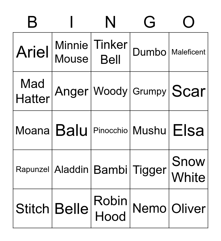 This bingo card has a free space and 24 words: Aladdin, Belle, Woody, Stitch, Maleficent, Ariel, Mad Hatter, Minnie Mouse, Mushu, Bambi, Grumpy, Moana, Tigger, Snow White, Anger, Nemo, Elsa, Tinker Bell, Scar, Balu, Oliver, Rapunzel, Dumbo and Robin Hood.