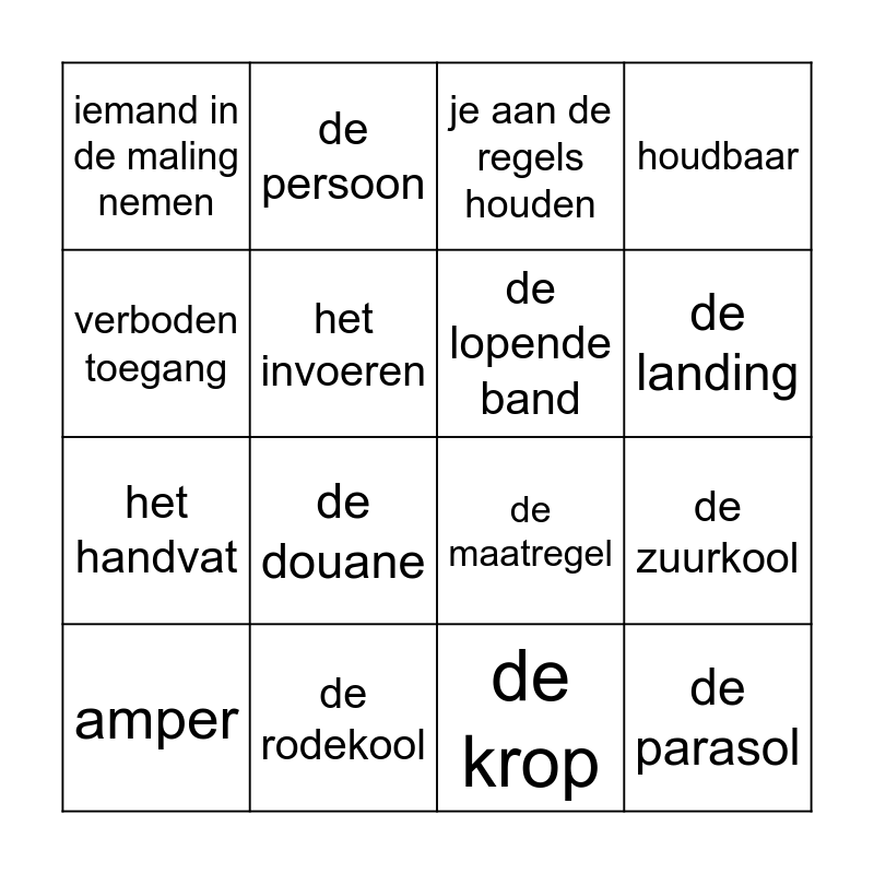 This bingo card has 16 words: de rodekool, de zuurkool, je aan de regels houden, iemand in de maling nemen, het handvat, de persoon, de maatregel, de krop, verboden toegang, het invoeren, amper, houdbaar, de douane, de landing, de lopende band and de parasol.