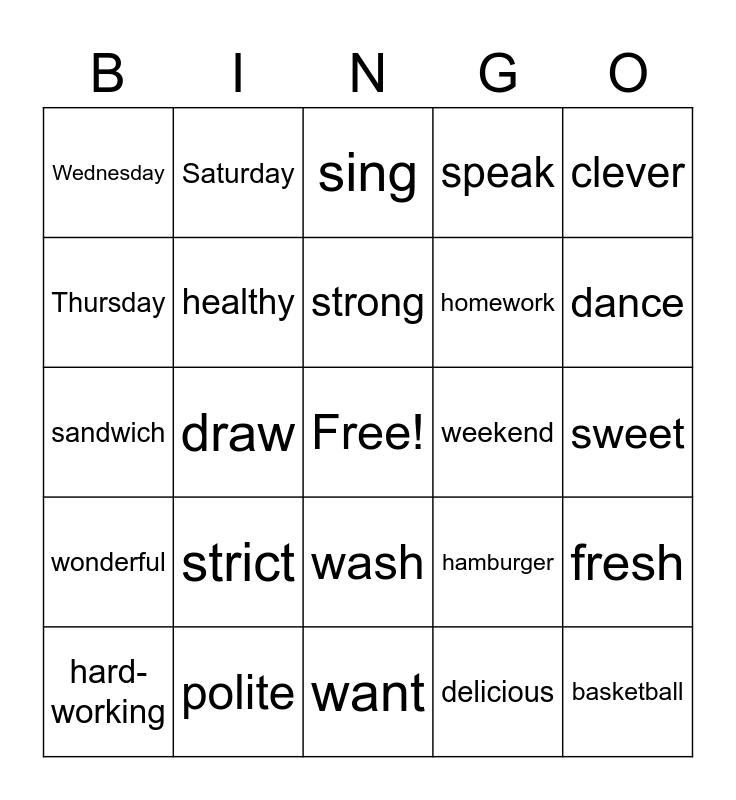 This bingo card has a free space and 24 words: strict, polite, strong, hard-working, clever, Wednesday, Thursday, Saturday, weekend, wash, homework, sandwich, hamburger, fresh, healthy, delicious, sweet, sing, dance, draw, basketball, wonderful, speak and want.