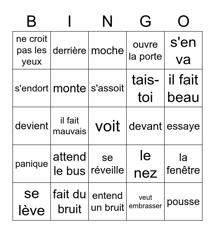 This bingo card has 25 words: attend le bus, entend un bruit, s'assoit, se lève, s'en va, ne croit pas les yeux, s'endort, derrière, devant, se réveille, tais-toi, devient, le nez, la fenêtre, monte, pousse, essaye, moche, il fait beau, il fait mauvais, voit, fait du bruit, panique, ouvre la porte and veut embrasser.
