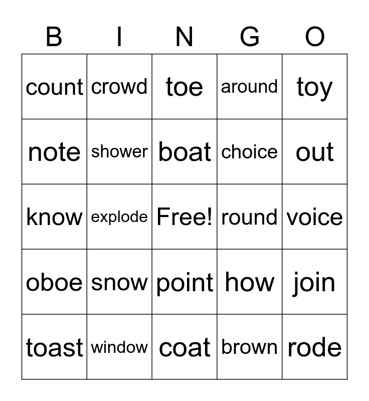 This bingo card has a free space and 29 words: toast, boy, explode, spoke, count, toe, shower, snow, round, window, voice, rode, coat, brown, out, enjoy, point, oboe, toy, know, how, soap, choice, note, around, crowd, join, boat and slowly.