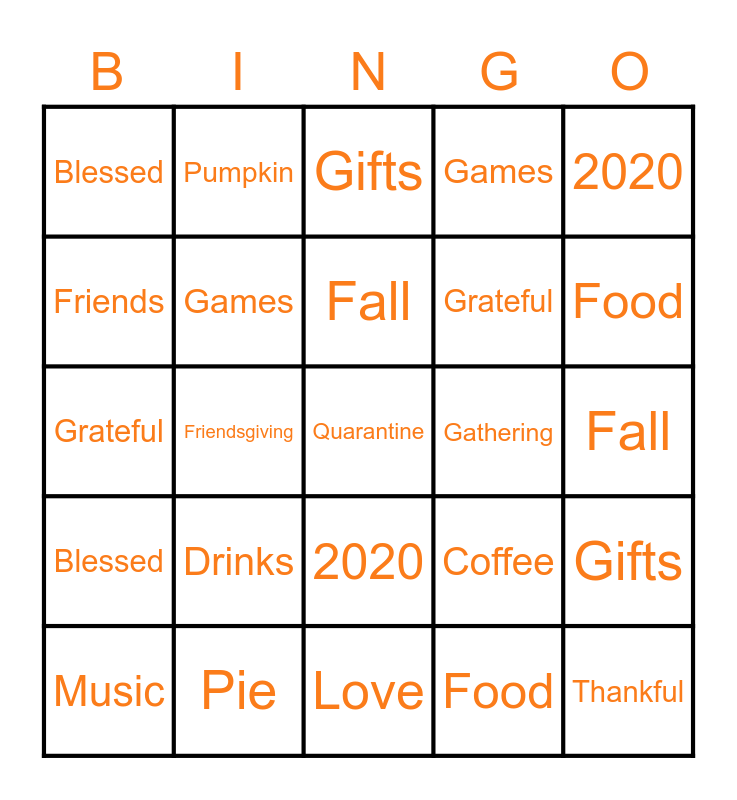 This bingo card has 53 words: Free!, Quarantine, Corona virus, Food, Drinks, Desserts, Pumpkin, Leaves, Friends, Family, Games, Love, Gifts, Coffee, Hookah, Music, Fall, Gathering, November, 2020, Friendsgiving, Thankful, Grateful, Blessed, Lattes, Pie, Charcoal, Quarantine, Corona virus, Food, Drinks, Desserts, Pumpkin, Leaves, Friends, Family, Games, Love, Gifts, Coffee, Hookah, Music, Fall, Gathering, November, 2020, Friendsgiving, Thankful, Grateful, Blessed, Lattes, Pie and Charcoal.