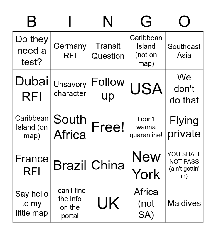 This bingo card has a free space and 27 words: New York, US State (not NY), USA, UK, Dubai RFI, Transit Question, Germany RFI, France RFI, I don't wanna quarantine!, YOU SHALL NOT PASS (ain't gettin' in), Caribbean Island (on map), Caribbean Island (not on map), Say hello to my little map, I can't find the info on the portal, We don't do that, You call that a subject line?, Unsavory character, Follow up, Brazil, Do they need a test?, Flying private, Africa (not SA), South Africa, Maldives, China, Southeast Asia and Australia.