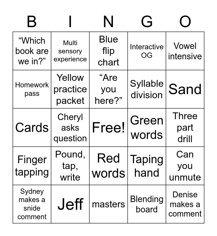 This bingo card has a free space and 30 words: Jeff, Eleanor, Cheryl asks question, Greg does hair, “Which book are we in?”, Blue flip chart, Yellow practice packet, Red words, Green words, masters, Three part drill, Denise makes a comment, Blending board, “my babies”, Sand, Etymonline, Taping hand, Finger tapping, Pound, tap, write, Vowel intensive, Cards, Recipe for reading, Multi sensory experience, Syllable division, Homework pass, Interactive OG, Can you unmute, Sydney makes a snide comment, “Are you here?” and Co-articulation.