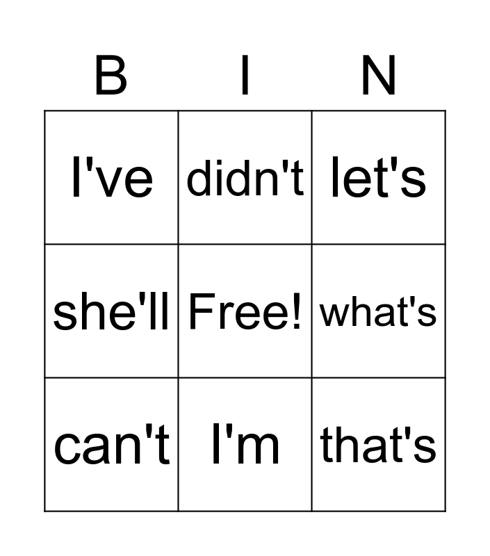 This bingo card has a free space and 11 words: aren't, I'm, that's, can't, didn't, let's, what's, don't, she'll, I've and we're.