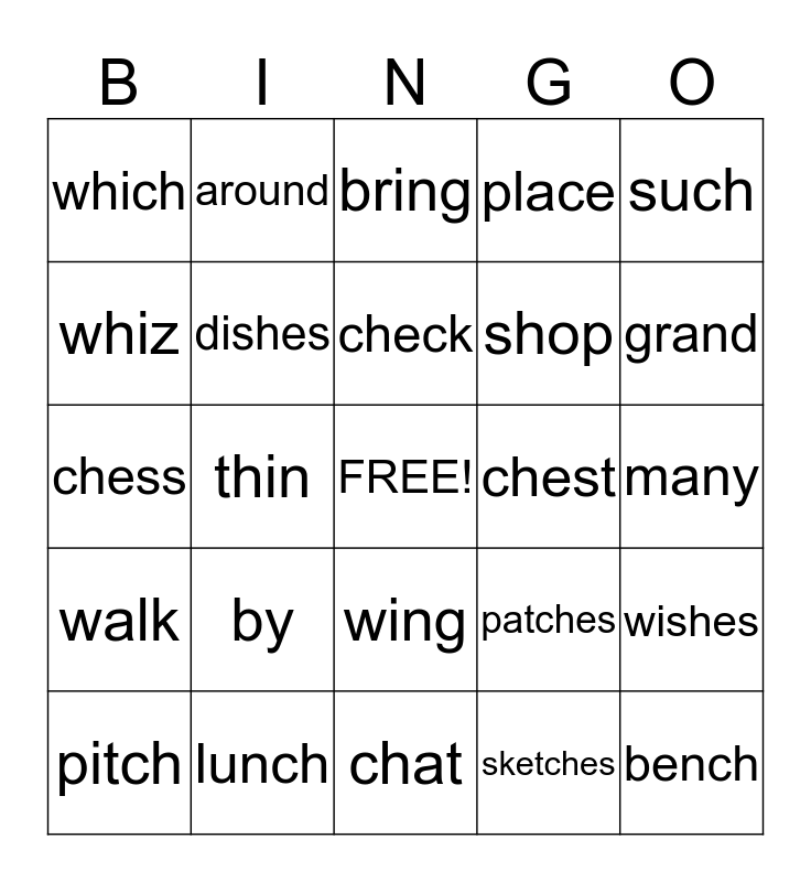 This bingo card has a free space and 24 words: by, lunch, check, pitch, such, which, whiz, around, chest, wing, shop, chess, patches, wishes, dishes, sketches, many, bring, grand, thin, bench, walk, place and chat.