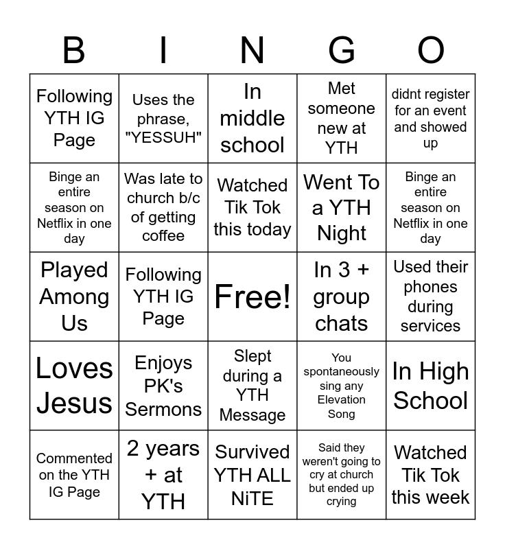 This bingo card has a free space and 24 words: Enjoys PK's Sermons, 2 years + at YTH, Watched Tik Tok this today, Commented on the YTH IG Page, didnt register for an event and showed up, Following YTH IG Page, Binge an entire season on Netflix in one day, Uses the phrase, "YESSUH", In 3 + group chats, Slept during a YTH Message, Went To a YTH Night, Played Among Us, You spontaneously sing any Elevation Song, In High School, Was late to church b/c of getting coffee, Said they weren't going to cry at church but ended up crying, Used their phones during services, In middle school, Binge an entire season on Netflix in one day, Following YTH IG Page, Watched Tik Tok this week, Loves Jesus, Met someone new at YTH and Survived YTH ALL NiTE.