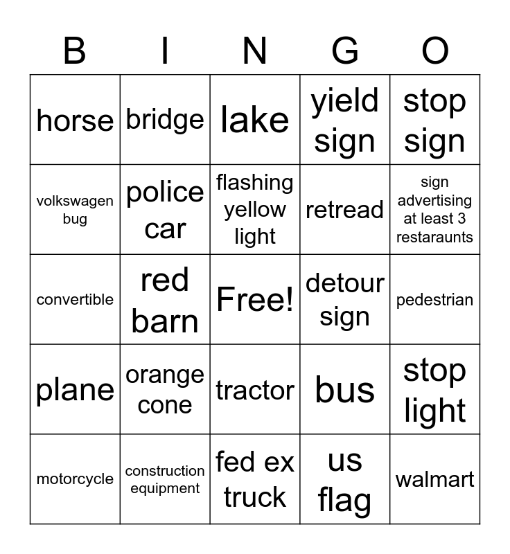 This bingo card has a free space and 29 words: motorcycle, semi w/blue cab, red barn, cow, horse, lake, police car, orange cone, detour sign, construction equipment, pedestrian, walmart, fed ex truck, us flag, sign advertising at least 3 restaraunts, windmill, tractor, plane, stop sign, convertible, bus, roadkill, retread, volkswagen bug, yield sign, bridge, stop light, flashing yellow light and 65 mph sign.