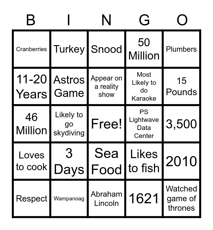 This bingo card has a free space and 45 words: Accept a dare, Watched game of thrones, Lived in 3 different states, Respect, September, 1621, Snood, Wattle, Plumbers, Wampanoag, 50 Million, PS Lightwave Data Center, Sea Food, 3 Days, John F. Kennedy, Abraham Lincoln, Squanto, 46 Million, Native American Heritage Day, 15 Pounds, Turkey, Male, Rafter, Cranberries, 280 Millions, 3,500, Thomas Jefferson, Owns a pet, Likes to fish, Loves to cook, Enjoys camping, 2010, 2015, Traveled outside of the US, Always happy, Likely to go skydiving, Less than 1 year, Driven over 100 mph, Plays video games 2Xs a week, Appear on a reality show, 11-20 Years, Most Likely to do Karaoke, Born & Raised in Houston, Astros Game and Sing in the shower.