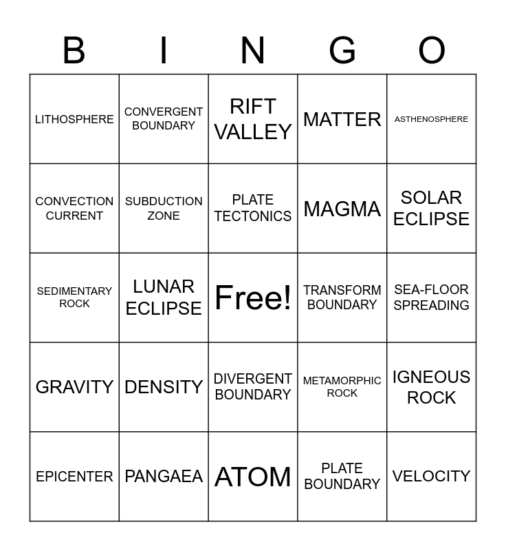 This bingo card has a free space and 24 words: DENSITY, PANGAEA, PLATE TECTONICS, EPICENTER, ASTHENOSPHERE, LITHOSPHERE, CONVECTION CURRENT, CONVERGENT BOUNDARY, TRANSFORM BOUNDARY, DIVERGENT BOUNDARY, MAGMA, SEDIMENTARY ROCK, METAMORPHIC ROCK, IGNEOUS ROCK, SUBDUCTION ZONE, PLATE BOUNDARY, SEA-FLOOR SPREADING, RIFT VALLEY, SOLAR ECLIPSE, LUNAR ECLIPSE, VELOCITY, GRAVITY, MATTER and ATOM.