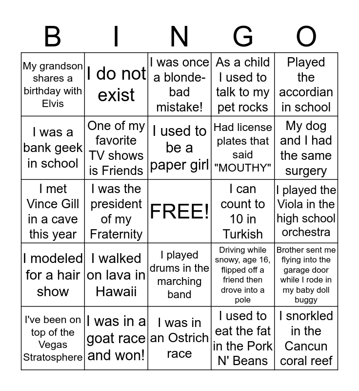 This bingo card has a free space and 24 words: I walked on lava in Hawaii, I was in a goat race and won!, I used to be a paper girl, I've been on top of the Vegas Stratosphere, Played the accordian in school, My grandson shares a birthday with Elvis, I was a bank geek in school, I do not exist, I can count to 10 in Turkish, I played drums in the marching band, Had license plates that said "MOUTHY", I met Vince Gill in a cave this year, Driving while snowy, age 16, flipped off a friend then drove into a pole, Brother sent me flying into the garage door while I rode in my baby doll buggy, One of my favorite TV shows is Friends, I used to eat the fat in the Pork N' Beans, I played the Viola in the high school orchestra, I was once a blonde- bad mistake!, My dog and I had the same surgery, I was the president of my Fraternity, I snorkled in the Cancun coral reef, I modeled for a hair show, As a child I used to talk to my pet rocks and I was in an Ostrich race.