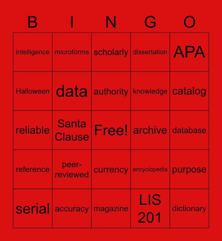 This bingo card has a free space and 24 words: serial, peer-reviewed, authority, LIS 201, APA, intelligence, microforms, scholarly, archive, database, reliable, data, encyclopedia, purpose, Halloween, accuracy, magazine, dissertation, catalog, reference, Santa Clause, currency, knowledge and dictionary.