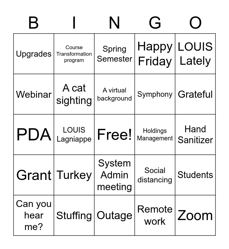 This bingo card has a free space and 55 words: Can you see my screen?, Can you hear me?, You’re muted, Upgrades, Outage, Masks, A cat sighting, Enterprise, Symphony, EDS, Happy Friday, COVID, Questions, Computer notification sounds, Open a ticket, SirsiDynix, LOUIS Lately, LOUIS Lagniappe, ILLiad, Zoom, Holdings Management, 6 feet apart, Social distancing, Spring Semester, TASK Ticket, A virtual background, Remote work, Library reopening, Hand Sanitizer, Students, Faculty, Data Control, Cloudsource, Conference, Webinar, PDA, Work From Home (WFM), Grant, JSTOR, Bibload, Course Transformation program, LOUIS Swag, Thanksgiving, Holidays, Turkey, Stuffing, Shopping, Pumpkin pie, Black Friday, Grateful, Who has their Christmas Tree up?, November, December, System Admin meeting and Finals.