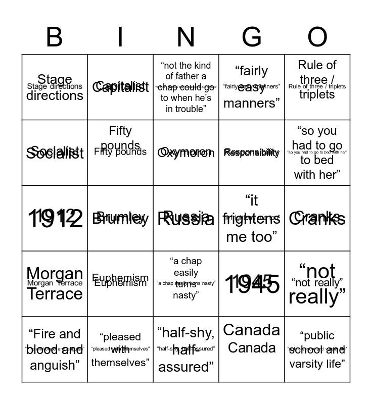 This bingo card has 25 images and 25 words: Euphemism, “half-shy, half-assured”, Oxymoron, “Fire and blood and anguish”, Rule of three / triplets, Stage directions, Socialist, Capitalist, “it frightens me too”, “a chap easily turns nasty”, Responsibility, 1912, 1945, “not really”, Fifty pounds, “public school and varsity life”, Cranks, “not the kind of father a chap could go to when he’s in trouble”, “so you had to go to bed with her”, Brumley, Russia, “pleased with themselves”, Morgan Terrace, “fairly easy manners” and Canada.