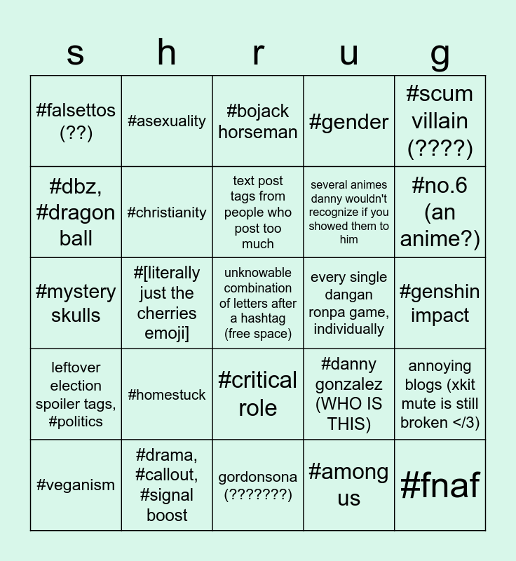 This bingo card has a free space and 24 words: #homestuck, #drama, #callout, #signal boost, text post tags from people who post too much, #veganism, #scum villain (????), #falsettos (??), #dbz, #dragon ball, #asexuality, every single dangan ronpa game, individually, #critical role, several animes danny wouldn't recognize if you showed them to him, #mystery skulls, #danny gonzalez (WHO IS THIS), annoying blogs (xkit mute is still broken </3), #christianity, #among us, #genshin impact, #bojack horseman, #no.6 (an anime?), #[literally just the cherries emoji], #fnaf, leftover election spoiler tags, #politics, #gender and gordonsona (???????).