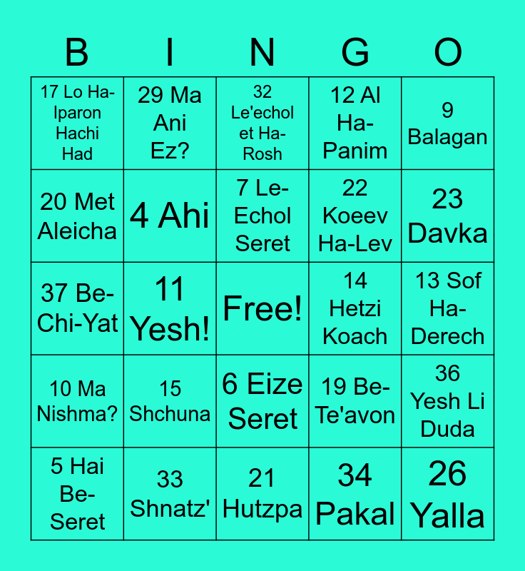 This bingo card has 39 words: 1 Ma HaMatzav, 2 Kapara, 3 Le-Haim, 4 Ahi, 5 Hai Be-Seret, 6 Eize Seret, 7 Le-Echol Seret, 8 Sababa, 9 Balagan, 10 Ma Nishma?, 11 Yesh!, 12 Al Ha-Panim, Free!, 13 Sof Ha-Derech, 14 Hetzi Koach, 15 Shchuna, 16 Shabbat Shalom, 17 Lo Ha-Iparon Hachi Had, 18 Titchadesh, 19 Be-Te'avon, 20 Met Aleicha, 21 Hutzpa, 22 Koeev Ha-Lev, 23 Davka, 24 Neshama, 25 Sof HaOlam Smola, 26 Yalla, 27 Tachles, 28 Yesh Matzav, 29 Ma Ani Ez?, 30 Hofer, 31 Yatzati Hummus, 32 Le'echol et Ha-Rosh, 33 Shnatz', 34 Pakal, 35 Latet Ba-Rosh, 36 Yesh Li Duda, 37 Be-Chi-Yat and 38 Kalllllllll.