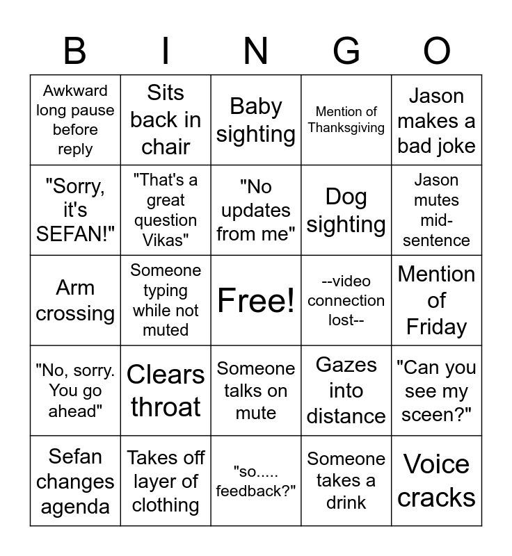 This bingo card has a free space and 24 words: Clears throat, Takes off layer of clothing, "No updates from me", Sefan changes agenda, Jason makes a bad joke, Awkward long pause before reply, "Sorry, it's SEFAN!", Sits back in chair, --video connection lost--, Someone talks on mute, Dog sighting, Arm crossing, Gazes into distance, "Can you see my sceen?", "That's a great question Vikas", Someone takes a drink, Mention of Friday, Baby sighting, Jason mutes mid-sentence, Someone typing while not muted, Voice cracks, "No, sorry. You go ahead", Mention of Thanksgiving and "so..... feedback?".