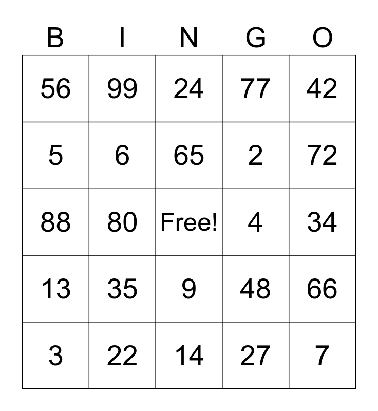 This bingo card has a free space and 24 words: 35, 22, 65, 3, 42, 56, 5, 99, 4, 9, 2, 88, 48, 66, 6, 27, 34, 24, 72, 80, 7, 13, 77 and 14.