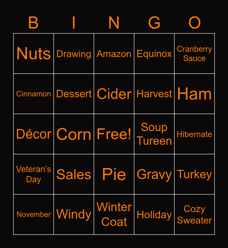 This bingo card has a free space and 75 words: “Gobble, Gobble”, Acorn, Amazon, Apple, Apple Cider, Autumn, Black Friday, Blanket, Cabin, Chestnuts, Chilly, Chopping Wood, Cider, Cinnamon, Comfy, Corn, Cornucopia, Cozy Sweater, Cranberries, Cranberry Sauce, Crisp, Décor, Dessert, Drawing, Equinox, Fall, Family, Feast, Fireplace, Flannel, Football, Friends, Gourd, Gravy, Ham, Harvest, Hay, Hayride, Hibernate, Holiday, Holiday Music, Leaf, Leftovers, Long Weekend, Maize, Moon, November, Nuts, October, Orange, Persimmon, Pie, Pinecone, PJs, Pumpkin, Pumpkin Pie, Quilt, Rainy, Rake, Red, Sales, Scarecrow, Scarf, Seasons, Serving Platter, Soup Tureen, Sparkling Cider, Stuffing, Thanksgiving, Turkey, Veteran’s Day, Windy, Wine, Winter Coat and Wreath.
