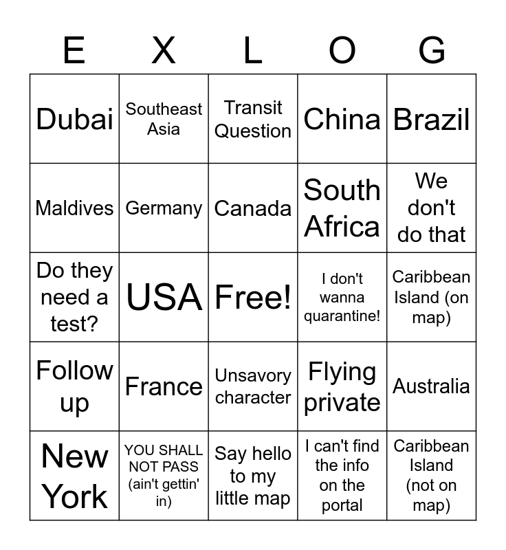 This bingo card has a free space and 29 words: New York, US State (not NY), USA, UK, Dubai, Transit Question, Germany, France, I don't wanna quarantine!, YOU SHALL NOT PASS (ain't gettin' in), Caribbean Island (on map), Caribbean Island (not on map), Say hello to my little map, I can't find the info on the portal, We don't do that, You call that a subject line?, Unsavory character, Follow up, Brazil, Do they need a test?, Flying private, Africa (not SA), South Africa, Maldives, China, Southeast Asia, Australia, Canada and Thank You note.