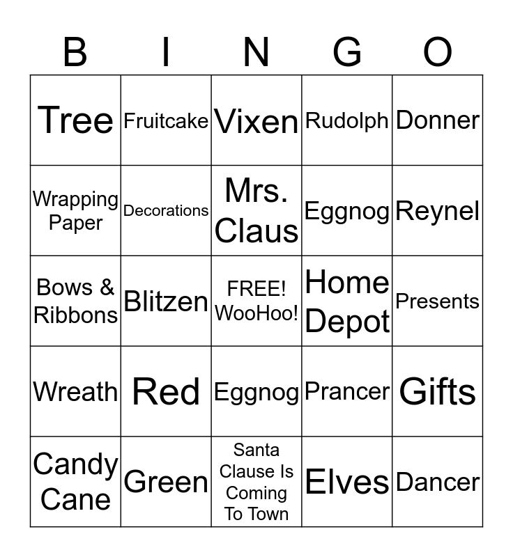 This bingo card has a free space and 55 words: Christmas, Candy Cane, Elf, Tree, Santa Clause Is Coming To Town, Reindeers, Decorations, Ornaments, Eggnog, Mistletoe, Rudolph, Dasher, Snow Man, I Saw Grandma Kissing Santa, Cupid, Comet, Donner, Blitzen, Presents, Dancer, Home Depot, Mrs. Clause, Prancer, Vixen, St. Nick, Mrs. Claus, Elves, Toys, Presents, Gifts, Joyful, Holy Night, 12 Days of Christmas, Candy Cane, Wrapping Paper, Bows & Ribbons, Ornaments, Wreath, Lights, Angels, Fruitcake, Ho! Ho! Ho!, Grinch, Bethlehem, Red, Green, Coal, Naughty or Nice?, Glenda, Reynel, Sonya, December, Gingerbread, Eggnog and Sled.