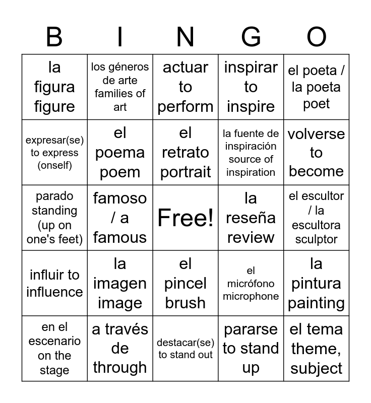 This bingo card has a free space and 66 words: la cerámica ceramics, pottery, la escultura sculpture, el mural mural, la pintura painting, el autorretrato self-portrait, las formas de arte types of art, los géneros de arte families of art, la naturaleza muerta still life, el retrato portrait, la paleta palette, el pincel brush, el escritor / la escritora writer, el escultor / la escultora sculptor, el poeta / la poeta poet, abstracto / a abstract, expresar(se) to express (onself), famoso / a famous, la figura figure, el fondo background, la fuente de inspiración source of inspiration, la imagen image, influir to influence, inspirar to inspire, la obra de arte work of art, el primer plano foreground, representar to represent, el sentimiento feeling, el siglo century, el tema theme, subject, el aplauso applause, en el escenario on the stage, la entrada ticket, el escenario stage, el espectáculo show, el micrófono microphone, a través de through, mostrar to show, parado standing (up on one's feet), pararse to stand up, parecerse (a) to look like, seem like, el poema poem, realizar to perform, accomplish, la reseña review, sentado seated, sonar a to sound like, el taller workshop, volverse to become, clásico / a classical, el compás rhythm / beat, el conjunto band, la danza dance, la letra lyrics, la melodía melody, el movimiento movement, el paso step, el ritmo rhythm, el tambor drum, la trompeta trumpet, actuar to perform, destacar(se) to stand out, el entusiasmo enthusiasm, exagerar to exaggerate, el gesto gesture, identificarse con to identify oneself with, la interpretación interpretation and interpretar to interpret.