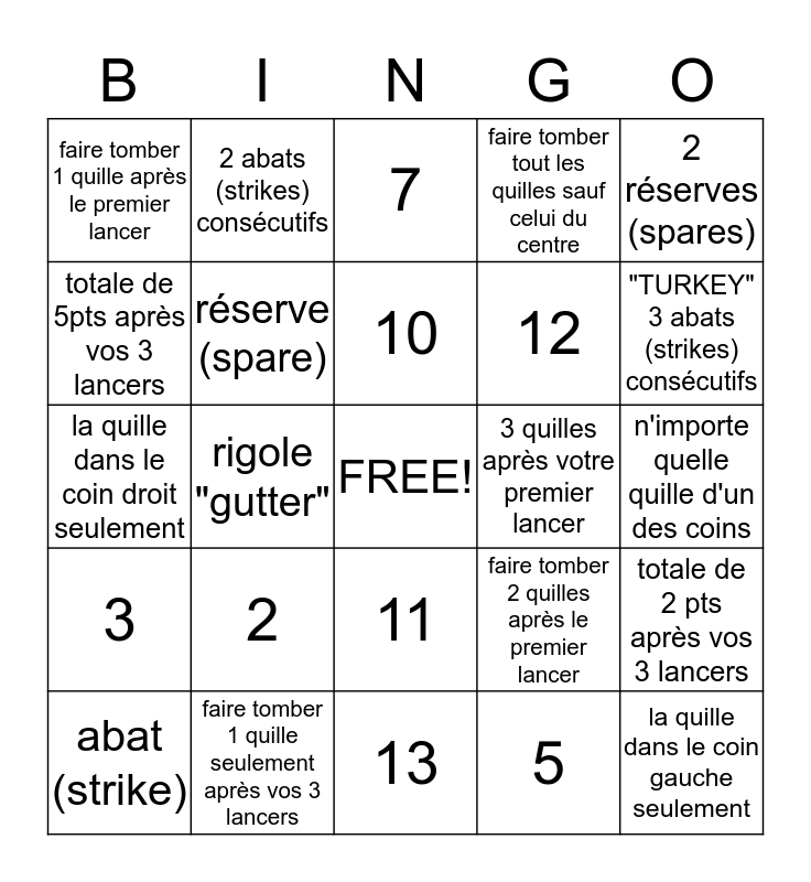 This bingo card has a free space and 24 words: 2, faire tomber 1 quille seulement après vos 3 lancers, 10, abat (strike), 2 réserves (spares), faire tomber 1 quille après le premier lancer, totale de 5pts après vos 3 lancers, 2 abats (strikes) consécutifs, 3 quilles après votre premier lancer, 11, 12, la quille dans le coin droit seulement, faire tomber 2 quilles après le premier lancer, totale de 2 pts après vos 3 lancers, réserve (spare), 5, n'importe quelle quille d'un des coins, 7, "TURKEY" 3 abats (strikes) consécutifs, rigole "gutter", la quille dans le coin gauche seulement, 3, faire tomber tout les quilles sauf celui du centre and 13.