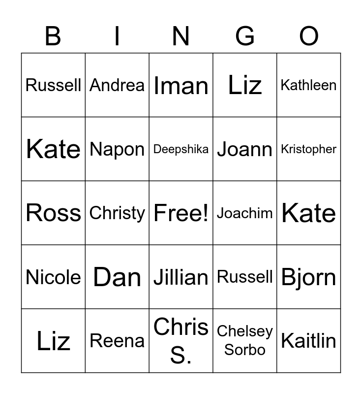 This bingo card has a free space and 49 words: Shannen, Kaitlin, Chris R., Chris S., Dan, Nick, Andrea, Francesca, Kate, David, Napon, Liz, Bjorn, Russell, Devon, Rhonda, Deepshika, Joachim, Brent, Kathleen, Christy, Chelsey Sorbo, Russell, Joann, Paige, Kristopher, Liz, Molly, Jillian, Nicole, Stephen, Disha, Mackenzie, Joann, Reena, Mary, Aaron, Trevor, Kate, Valentina, Chelsea Savoth, Mike, Monica, Stephanie, Ross, Iman, Alberto, Sayeda and Nancy.